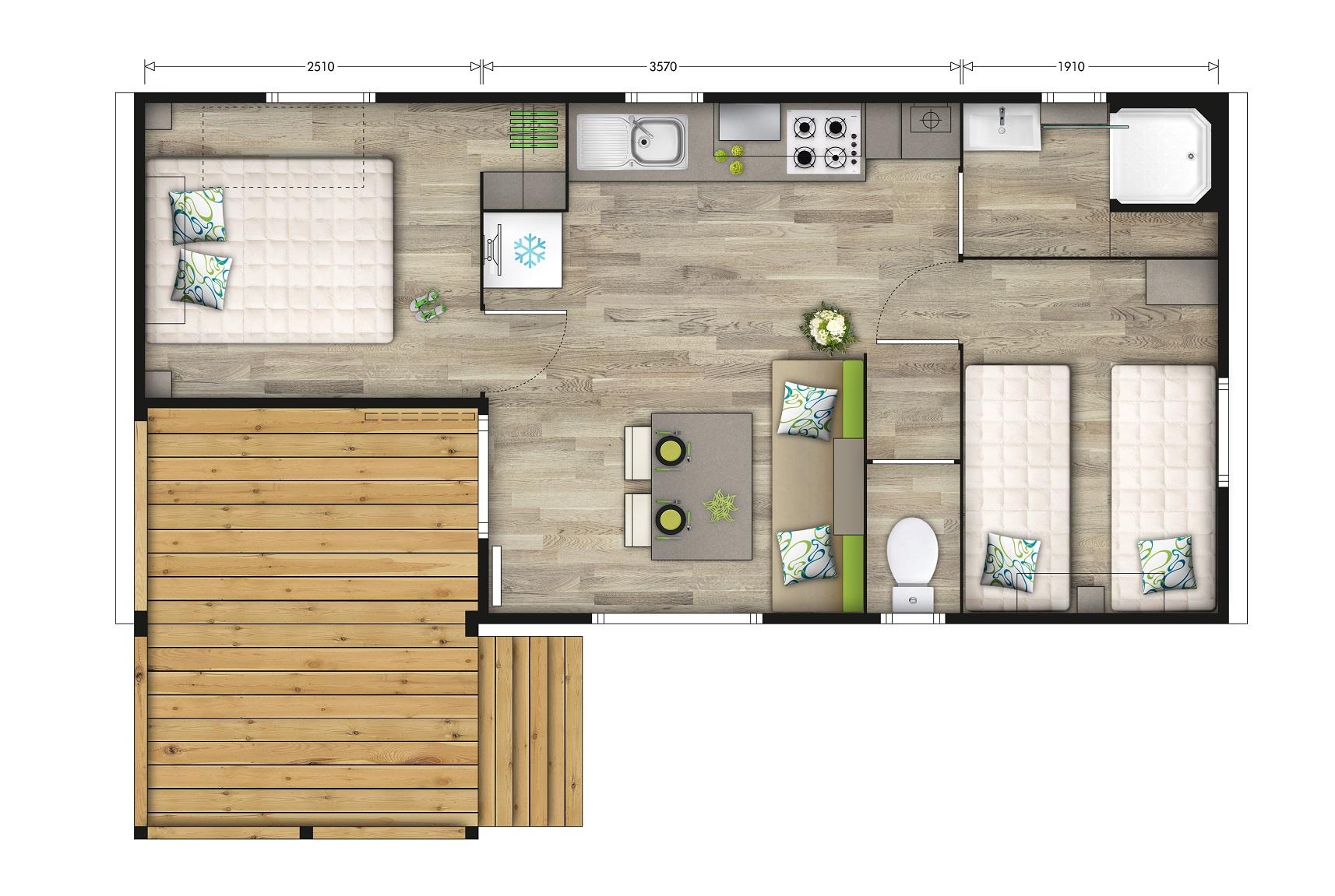 Mobil-home MALAGA 27m² – 2 chambres avec terrasse bois semi couverte.