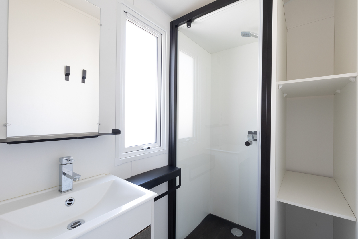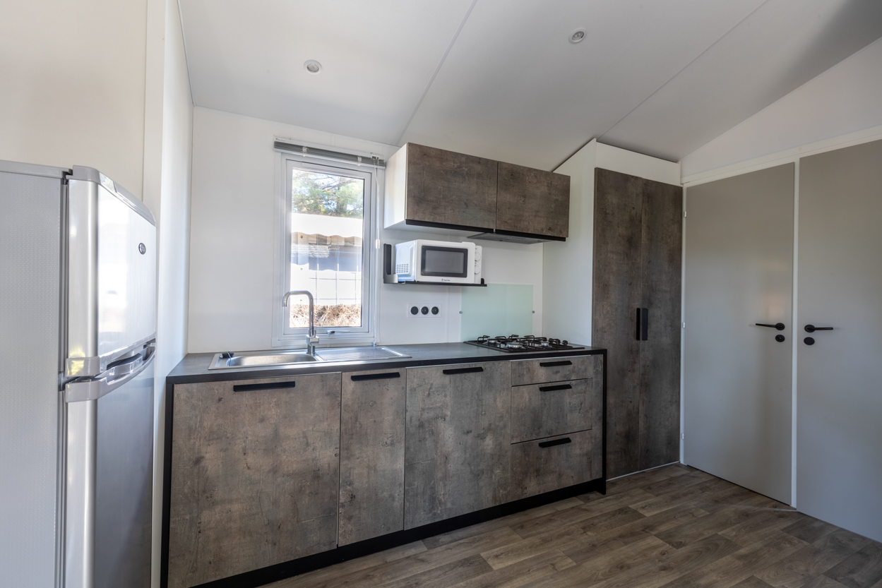 Mobil-home MALAGA BOIS 27m² – 2 chambres – 4 pers, terrasse bois semi couverte